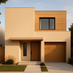 En lugar de la típica fachada totalmente blanca, las casas juegan con bloques de color suave y texturas. Las fachadas de casa modernas con este estilo transmiten orden, pero también calidez: se sienten limpias sin parecer una clínica.